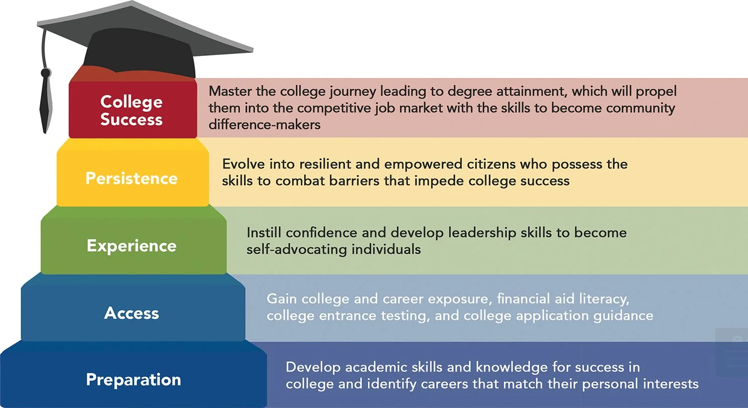 To empower every student with the mindset, resources, and unwavering support needed to not only gain acceptance to their ideal college but also to confidently and successfully navigate the collegiate environment, ensuring their path form high school to graduation is seamless and certain.